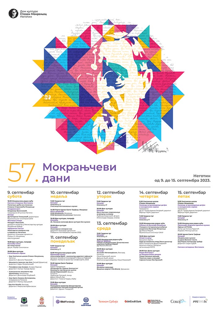 U Negotinu će , u subotu 9. septembra biti svečano otvoreno 57. izdanje festivala Mokranjčevi dani. U koncertnom delu svečanog otvaranja učestvuje Novosadski kamerni hor kao i horovi iz Negotina koji će, uz dirigenta, Božidara Crnjanskog, izvesti 6. rukovet S.St.Mokranjca.