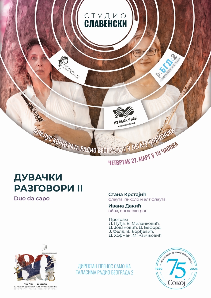 На седмом концерту из циклуса наступа Duo da capo који чине флаутисткиња Стана Крстајић и обоисткиња Ивана Дакић. Оне ће извести програм под називом Дувачки разговори 2 сачињен од композиција Луне Пуђе, Доротее Хофман, Драгане Јовановић, Дејвида Бедфорда, Јиндриха Фелда, Владимира Ђорђевића и Милоша Раичковића. Улаз на концерт је слободан.
